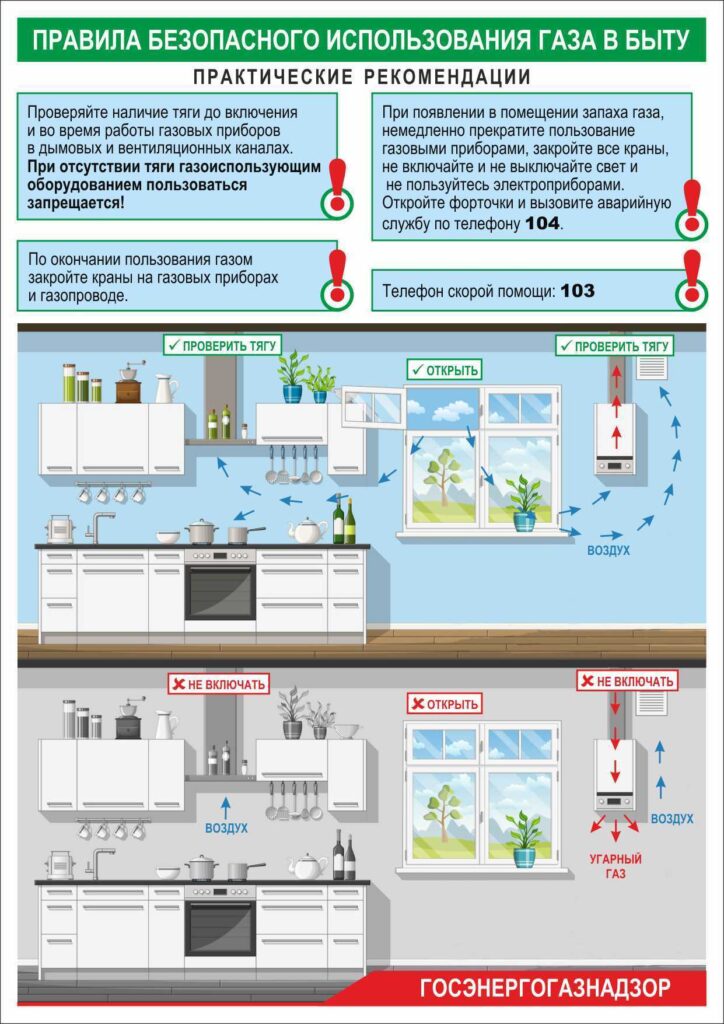При возникновении запаха газа перекройте все краны на газовом оборудовании и кран перед ним, откройте окна для проветривания, покиньте загазованное помещение и немедленно обратитесь в аварийную службу по телефону 104. При этом не допускайте пользования огнем, курения, включения и отключения электроосвещения и электроприборов, так как малейшая искра в загазованном помещении может привести к взрыву и пожару.